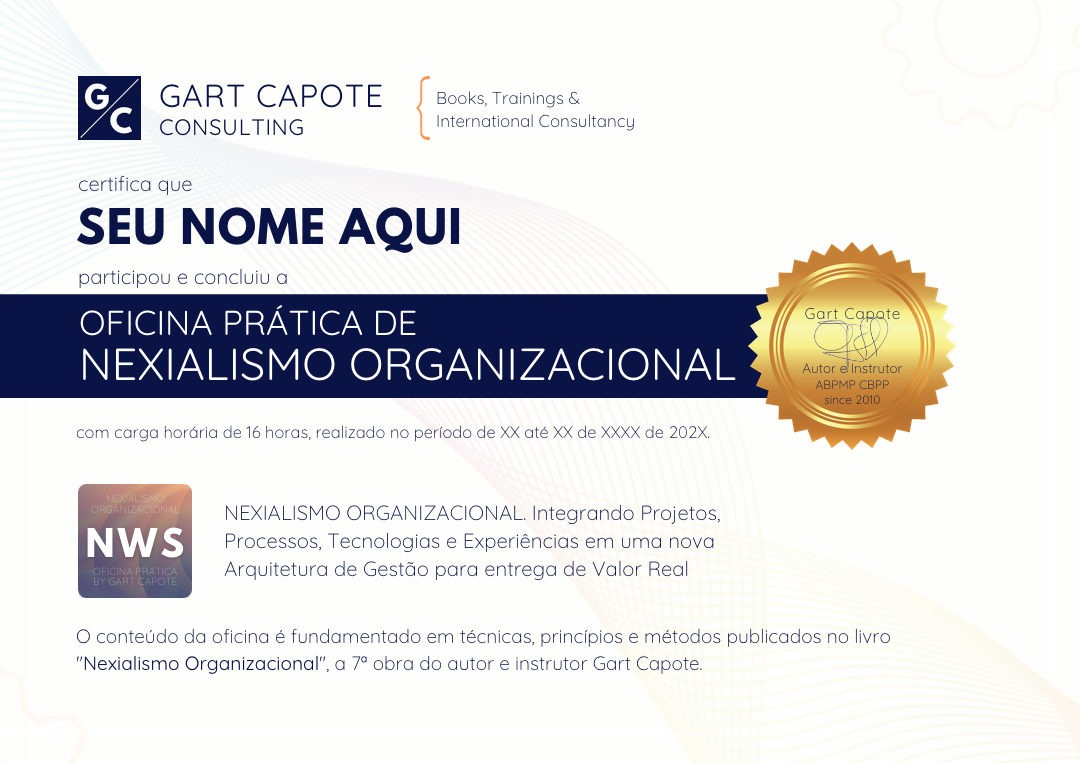 O NEXOR WS é uma oficina prática e presencial para profissionais que precisam qualificar decisões complexas antes de executá-las. Aqui, projetos, processos, experiências e arquitetura organizacional são trabalhados de forma integrada com o Nexialismo Organizacional.